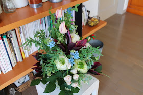 ドラセナのこの深い色とブルースターそしてラナンキュラス、スプレーバラの白、白菜の花、こでまり、優しげなこのチューリップとなんといい組み合わせなんでしょう。今の私の気分にぴったりです。